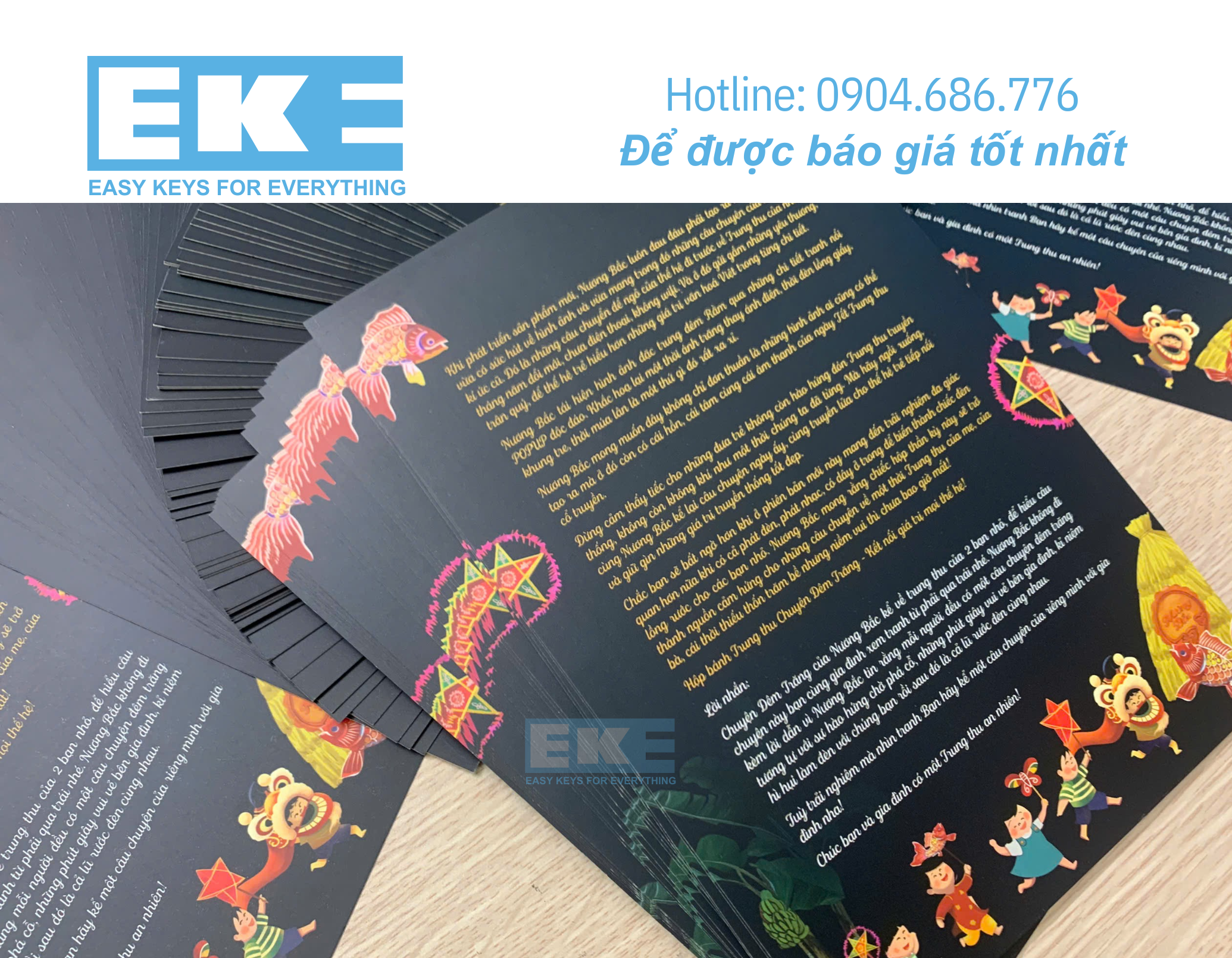 Mỗi mùa Trăng Rằm, bên cạnh những chiếc bánh nồng nàn hương vị, một tấm thiệp Trung Thu tinh tế chính là món quà nhỏ nhưng chứa đựng tình cảm lớn lao. Với công nghệ in ấn hiện đại từ Eke, thiệp Trung Thu không chỉ là lời chúc, mà còn là sự gửi gắm yêu thương, trân trọng và gắn kết bền chặt.